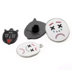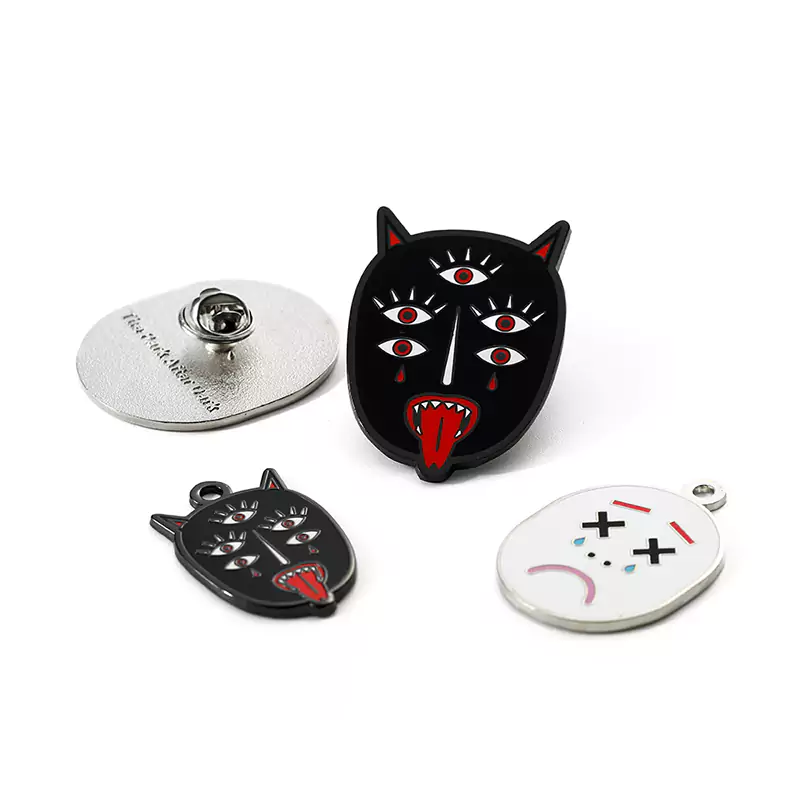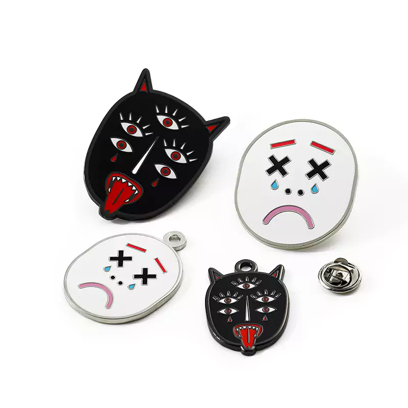 This pin anime character is a black and white face devil enamel rubber buckle badge pin. It features a striking visual design with a devil¡¯s face in black and white. Made from rubber enamel, it has a soft and durable texture. The backside has a rubber buckle pin for easy attachment to clothing or bags. Whether used as a decorative accessory or for personal expression, this badge pin is sure to capture attention.