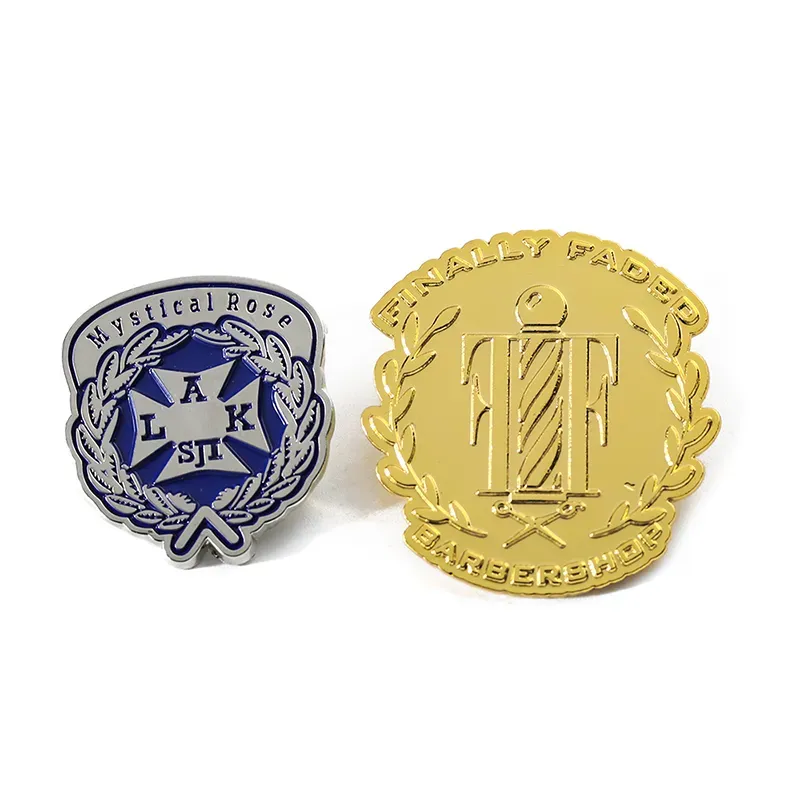 This golden irregular pin is made of alloy, with vivid color layers created via enamel painting. The left piece centers on a barber pole and scissors, paired with laurel leaves and the text ¡°FINALLY FADED BARBERSHOP,¡± exuding a vintage artisanal charm. The right shield-shaped piece features a blue-silver Maltese cross and the words ¡°Mystical Rose,¡± looking elegant and solemn. Both pins boast a heavy texture and clear details, making them distinctive accessories that showcase personality and sentiment.