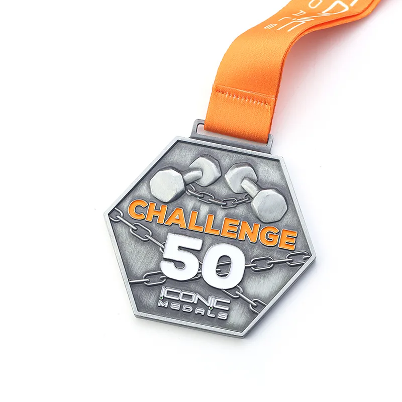 The Hexagonal Ancient Silver 50 Number Dumbbell Weightlifting Medal is a unique and eye-catching award. Crafted in an hexagonal shape with an antique silver finish, it features a prominent ¡¯50¡¯ number and a dumbbell design, symbolizing strength and achievement. This medal is custom-made using high-quality materials, perfect for honoring weightlifting successes.