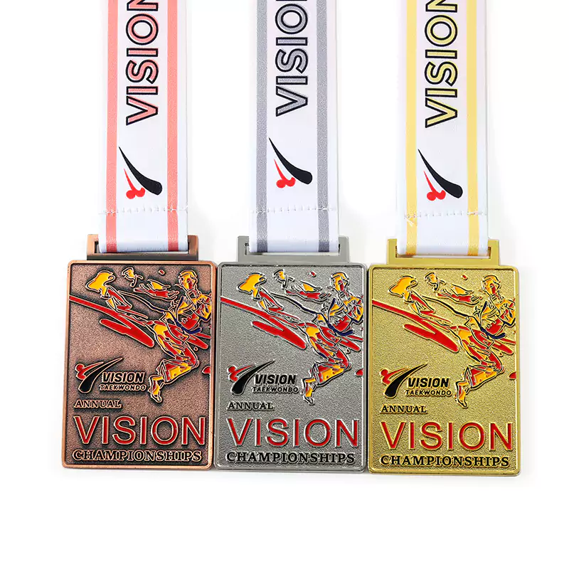 Taekwondo Soft Enamel Square Gold, Silver, and Bronze Medals are exquisite awards with a square shape. Made from soft enamel, these medals feature a vibrant and glossy appearance. The gold, silver, and bronze finishes represent different levels of achievement. Perfectly capturing the essence of Taekwondo, these medals showcase the sport¡¯s elegance and power. They serve as a prestigious recognition for the skill, dedication, and accomplishments of Taekwondo practitioners.